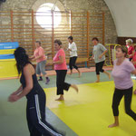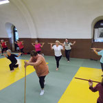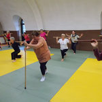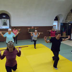 Exercices d'équilibre et de coordination faisant travailler le tonus musculaire et les abdos-fessiers à l'aide du bâton, de l’élastique, des altères; le tout rythmé par une musique d'ambiance.